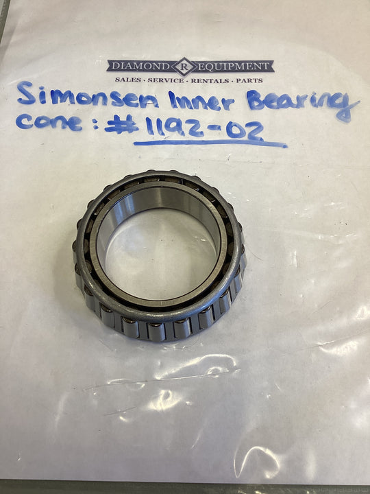 Simonsen Inner Bearing Cone: #1192-02 Part #1192-02 is a Wheel Bearing Cone used in the heavy-duty hub assemblies of Simonsen Industries pull-type spreaders. It is a critical internal component of the tapered roller bearing system that supports the main axle. ...